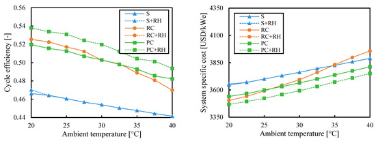 Cycle efficiency and system-specific cost as a function of ambient temperature when the efficiency is maximized. Legend: S (simple), RC (recompression), PC (partial cooling), and RH (reheating).