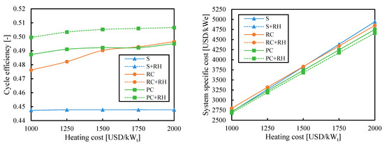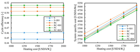 Since the heating cost in CSP (composed of the solar field and primary heat exchanger) is the greatest cost of the system [18], the objective of increasing the cycle efficiency has always been to reduce the effect of the heating cost on the system cost. However, previous figures have shown that the highest efficiency cycle configuration may not be the cheapest one. Figure 9 analyzes the influence of the heating cost when the efficiency is maximized. The heating cost had no impact on the cycle efficiency since the former was not considered in the optimization to maximize efficiency. However, it had a big impact on the system cost. For example, systems with a simple (S) cycle showed the lowest costs when the heating cost was 1000 USD/kWt, but they were more expensive than systems with partial cooling (PC) when the heating cost was 2000 USD/kWt.