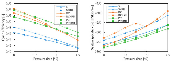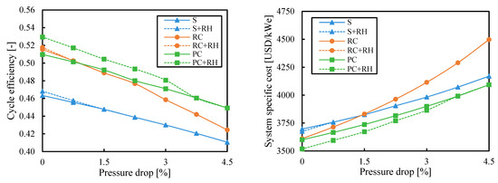 Cycle efficiency and system-specific cost as a function of pressure drop when the efficiency is maximized. Legend: S (simple), RC (recompression), PC (partial cooling), and RH (reheating).