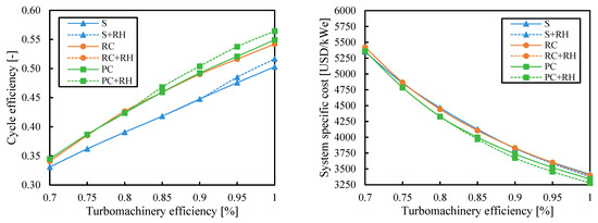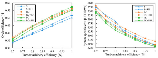 Cycle efficiency and system-specific cost as a function of turbomachinery efficiency when the system cost is minimized. Legend: S (simple), RC (recompression), PC (partial cooling), and RH (reheating).