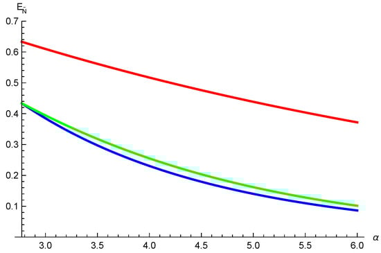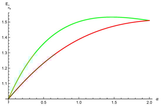 where , , and . One obtains , and . Setting , and , we have , and . Using relation (2) we have , and . Thus, from our result (9), and from the result (3) given in Ref. []. One can see our inequality (9) is tighter than the result (3) in Ref. [] for , see Figure 1.