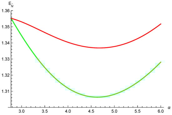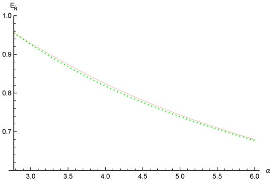 The red line is the exact value of . The green line represents the lower bound from our results (9).