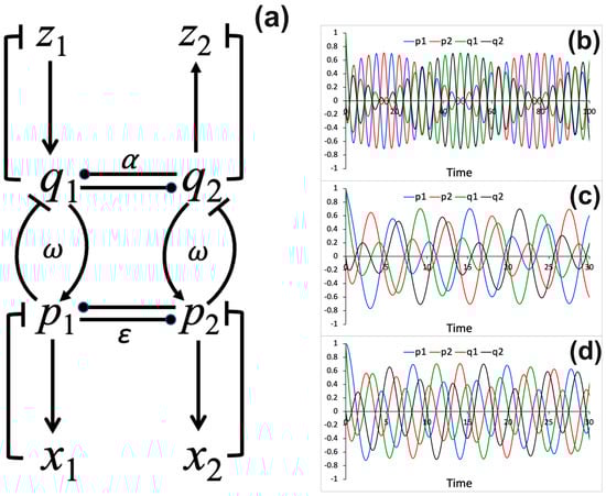 The interaction diagram and dynamical relationships among processes. (a) A diagram that shows interactions among processes. (b–d) Numerical solutions for the time evolution of and processes computed using different values of the coupling constant: (b) , (c) , (d) . In all simulations, and , thus, representing mutual inhibition between the and processes and between the and processes. The following initial conditions are used: , , and , .