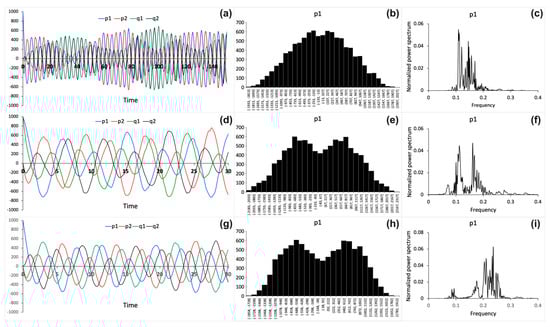 When two oscillatory systems are coupled, they modulate each other and, thus, the oscillatory dynamics of the coupled system are altered. The modulation depends on the parameter , that describes the binding strength between two oscillatory systems. This is seen in Figure 1a. Figure 1b–d demonstrate how the binding strength parameter influences the modulation of two coupled oscillatory systems. To characterize the robustness of the coupled system against noise, stochastic simulations are performed. The results of the stochastic model simulations are shown in Figure 2. The stochastic model is simulated using different values of the binding strength parameter . Figure 2a,d,g present the stochastic trajectories for the and processes obtained for the binding strength parameter values = 0.1, 0.5, and 1. These results can be compared to the numerical results of the deterministic model shown in Figure 1b–d, which are obtained for the same parameter values; however, the initial conditions used for the simulation results in Figure 1 and Figure 2 are different. Figure 2b,e,h show distribution histograms for the process , obtained from trajectories recorded over much larger time frames (>1000 arb. u.) than shown in Figure 2a,d,g. Also, for the and processes, the corresponding histograms (not shown) appear similar to those shown in Figure 2a,d,g. Normalized power spectral densities are also computed from trajectories, as described in the Methods section. Alteration of the normalized power spectral densities for the process as a function of varied binding strength parameter values is demonstrated in Figure 2c,f,i. There is a shift of normalized power spectrum peaks to higher frequencies as the binding strength increases.