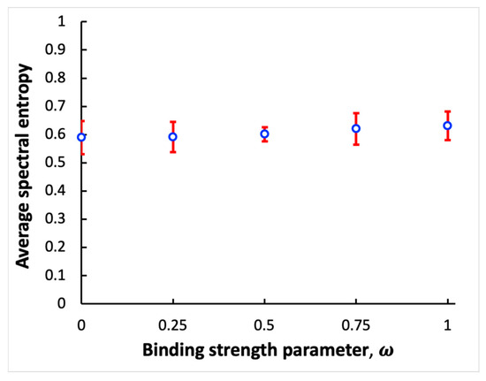 Next, spectral entropy is calculated using the power spectra to quantify sensitivity of the coupled systems of processes to noise. For cases shown in Figure 2, spectral entropy values of ≈0.55, 0.57, and 0.55 are obtained using the power spectra shown in Figure 2c,f,i, with binding strength parameter values 0.1, 0.5, and 1, respectively. Because the spectral entropy values do not change significantly with alteration of the binding strength parameters, it can be concluded that strongly and weakly bound oscillatory systems are equally robust against noise. To test this hypothesis in a more systematic way, fifty independent simulation experiments for the coupled systems of processes are performed, with ten simulation experiments for each of five different values of the binding strength parameter: = 0, 0.25, 0.5, 0.75, and 1. In each independent simulation, the spectral entropy value is computed. Then, the average over ten spectral entropy values is calculated for each specific parameter value. Figure 3 shows the average spectral entropy values plotted versus the binding strength parameter. The error bars represent standard deviation values. The results indicate that the robustness of the coupled systems against noise does not vary significantly when the binding strength changes. Therefore, the binding mechanism used to couple two oscillatory systems is resilient to noise.