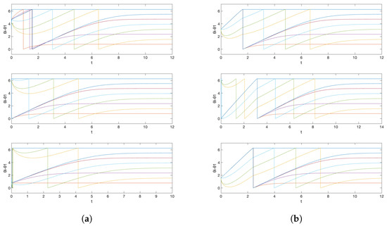 where the notation denotes the cardinality of the set. By repeating this argument (i.e., by replacing the role of with ), we arrive after finitely many steps at the index set such that , which yields a contradiction. This means that there is no such sequence that makes nonempty. Similarly, it can be seen that there is no sequence that makes nonempty. Therefore, we conclude there is no such finite time T, and thus, for all .