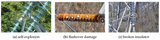 Appearance overview of insulator defects. (a) Self-explosion. (b) Flashover damage. (c) Broken insulator.