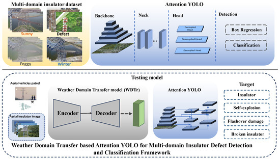 Currently, deep learning-based insulation defect detection models are trained by sunny insulator images from the China Power Line Insulator Subset Dataset (CPLID), which X. Tao et al. [20] proposed in 2018. However, these models are unsuitable for multi-domain weather insulation defect detection tasks. Compared to sunny days, foggy days can result in low-quality insulator images of UAV inspections and often struggle to accurately identify defect targets; snowy days may cover up insulators, and the model fails to detect targets. Additionally, frost weather conditions may condense on the surface of insulators and change their shapes, thus affecting the recognition capabilities of the detection model. Various weather conditions significantly impact the safe operation of power transmission line insulators, so studying multi-domain insulation defect detection for power transmission lines based on UAV inspection has important practical significance for ensuring the safety and stability of power grids. In this paper, we propose a weather domain synthesis network for extracting cross-modality discriminative information on multi-domain insulator defect detection and classification tasks to mimic real-world scenarios. The detection and classification framework is shown in Figure 2.
