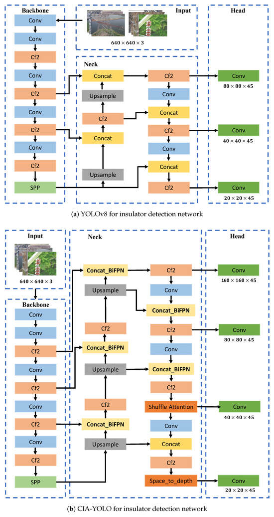 Insulator detection network. (a) YOLOv8 for insulator detection network. (b) Cross-modality Information Attention YOLO for insulator detection network. We added a new small target detection layer, used a repeated weighted bidirectional feature pyramid network for feature fusion, and introduced an effective attention mechanism to enable the network to accurately focus on insulator defect information with the input, improving the detection accuracy of multi-domain insulators. At the same time, it reduces the model complexity and computational overhead.