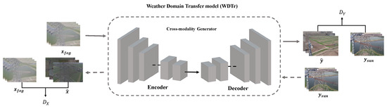 In the WDSt module, we trained from scratch using the Adam solver [31] with a batch size of 1 and a learning rate of 0.0002. We keep the same learning rate for the first 100 epochs and linearly decay the rate to zero over the next 100 epochs. In the cyclic consistency loss (Section 3.3), we set in Formula (7). Specifically, in the test model, we first use the WDSt module to convert insulator images under diverse weather conditions (e.g., snowy, rainy, and foggy weather) into a unified weather domain (sunny weather) for insulator defect detection and classification using the Cross-modality Information Attention YOLO model, to decrease the existing domain gap and improve the detection capability for multi-domain insulator defects.