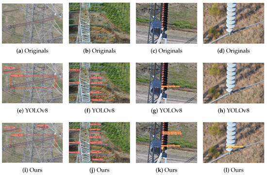 Insulators operate outdoors and are deeply affected by weather changes, leading to faults. In complex environments, the targets of insulator defects are small and easily concealed, especially flashover damage and broken insulator defects that are difficult to detect. Therefore, if a model can accurately identify defects in complex scenarios, it is crucial to ensure the safe operation of electrical power. In addition, we tested the detection results of four groups of insulator models in different scenarios, shown in Figure 7. The first one tested the model’s ability to detect insulators under foggy weather conditions; the second one tested the model’s ability to detect multiple targets in remote views; and the last two are the ability to detect flashover damage and broken insulator defects that are difficult to identify. The four sets of detection results in Figure 7 show that the detection results of this method are superior to those using the original YOLOv8. In foggy conditions, using the original YOLOv8 means that it cannot detect insulators that are obscured by towers. In the distant view with complex scenarios, the detection model proposed in this paper can detect more insulator strings, as the detection results of flashover damage and broken insulator defects show that the proposed method can not only detect more comprehensive flashover damage, but also has a more sensitive detection of broken insulator defects.