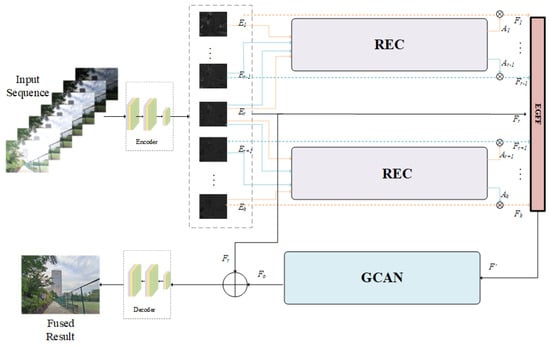 The overall network architecture of Ref-MEF, as proposed, follows a basic autoencoder framework. It consists of an encoder section with three convolutional layers. The reference-guided exposure correction (REC) module is responsible for feature correction, exposure-guided feature fusion (EGFF) handles feature fusion, and gated context aggregation network (GCAN) along with global residual connections are responsible for feature reconstruction. The decoder section is tasked with restoring the image to the RGB image space.