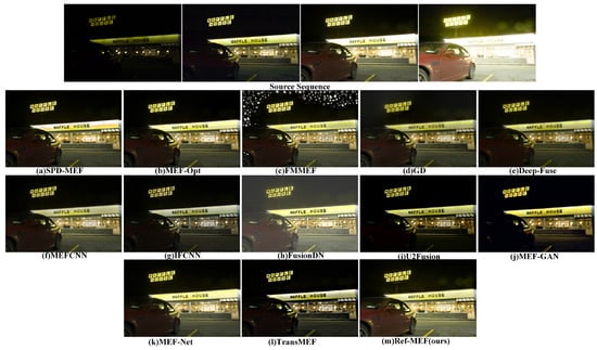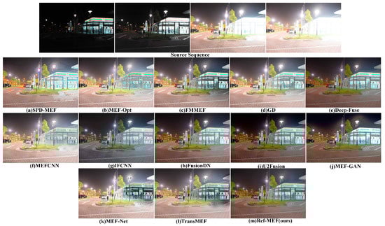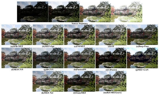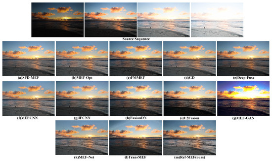 Our study involved a comparative analysis of Ref-MEF with twelve state-of-the-art MEF techniques. These encompass traditional spatial and transformation domain-based algorithms such as SPD-MEF [17], MEF-Opt [8], FMMEF [37], and GD [3]. Additionally, we scrutinized several advanced deep learning methodologies, including DeepFuse [7], MEFCNN [38], IFCNN [11], FusionDN [20], U2Fusion [21], MEF-GAN [9], MEF-Net [12], and Trans-MEF [30].