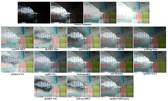 Figure 6’s environment, atop a shopping mall, presents a wide exposure range challenge for fusion algorithms. MEF-Opt, FMMEF, MEF-CNN, MEF-Net, and Trans-MEF suffer from pronounced ghosting artifacts, particularly near windows with direct sunlight, impacting the overall visual quality. Additionally, SPD-MEF produces an overly bright and sharp image, whereas GD and DeepFuse yield overall dark results. IFCNN shows significant color deviation, with a predominant greenish tint. In contrast, FusionDN, U2Fusion, and Ref-MEF offer superior subjective visual effects. Notably, Ref-MEF adeptly handles multiple exposure challenges, such as ghosting, over-sharpening, and color deviation, providing balanced visuals in the challenging top-floor indoor setting, positioning it among the best in this context.