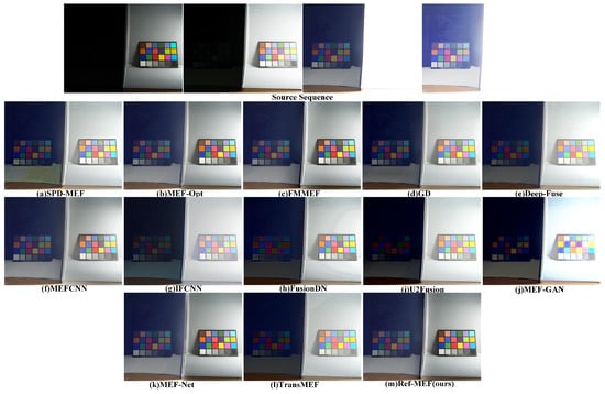 In deep learning methods, aside from MEF-Net [12] which can flexibly handle multiple inputs, the number of multiple exposure images processed by other networks is fixed. To ensure the consistency of the comparison, we adopted a nested model strategy, that is; first selecting two images to merge to obtain an intermediate result, then merging this result with other LDR images, and repeating this process until the final result is obtained, thus ensuring that the number of inputs for all networks is the same.