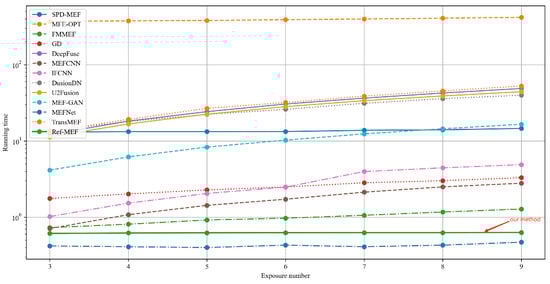 In order to compare the computational costs of the MEF algorithm, we demonstrate the running time with varying numbers of exposure shots, as depicted in Figure 11. These times are the average fusion times under a scenario with a fixed spatial resolution of 512 s (resizing the shorter side to 512 while preserving the aspect ratio). Among these algorithms, MEF-Opt [8] has the longest running time, which is not surprising as it employs iterative methods to perform global image optimization to satisfy the MEF-SSIM [19] criterion. Compared to other learning-based methods, Ref-MEF does not require more model layers due to its unique network structure when the number of exposure shots increases, and therefore the running time does not change much. However, other deep learning methods show a linear growth trend when the number of exposure shots increases. Although the algorithm of MEF-Net [12] is slightly faster than ours, our algorithm significantly outperforms MEF-Net in both objective and subjective assessments of the fusion results.