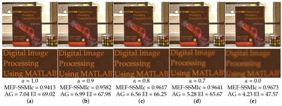 In Figure 12, We showcase fusion outcomes related to scenes involving books, achieved by adjusting various balance factors, represented as . Upon closer inspection of the image text details, it is observed that in the absence of the fidelity term for gradients (), even though MEF-SSIMc based on the image structure reaches its maximum, the image details remain incomplete, resulting in inadequate clarity. Experimental findings reveal that as increases to 0.7, there is a notable enhancement in image clarity, as evidenced by metrics such as average gradient (AG) and edge intensity (EI), describing image features. A further increment of to 0.9 leads to a stabilization of image clarity. However, metrics related to image features, such as AG and EI, exhibit limited improvement at this stage. To achieve a balance between image features and the preservation of the main image structure, the balance factor is set to 0.9. This decision is made with performance considerations in mind, aiming to retain texture and details while maximizing the maintenance of the image’s primary structure.