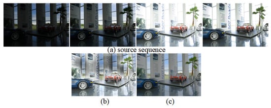 where ∇ is the gradient operator, is the normalized weight. The specific calculation formula can be referred to in Equation (6). F represents the fused image. Our ultimate optimization goal is to simultaneously maximize MEF-SSIMc and minimize the gradient fidelity term. Maximizing MEF-SSIMc is used to optimize the general quality of the fused image, including spatial information, color information, exposure information, and mid-to-low frequency components. Minimizing is used to optimize the details of the mid-to-high frequency components. Therefore, we can construct the following loss function: