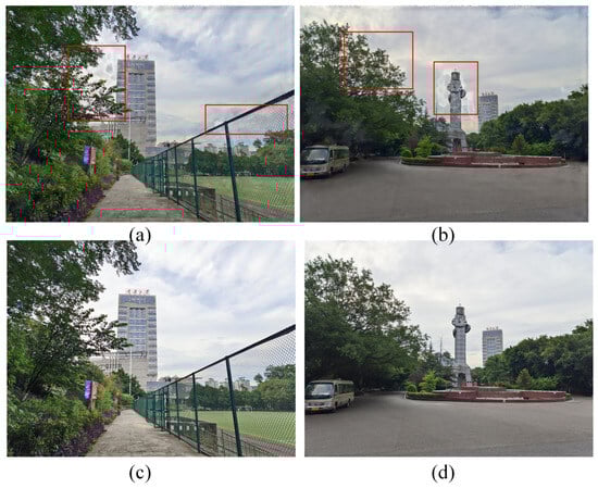 Subjective experimental results of the ablation of the separated convolution. The regions identified by the red boxes display notable grid artifacts. The first row (a,b) displays the results absent the use of separated convolution, whereas the effects of applying separated convolution are exhibited in the second row (c,d).