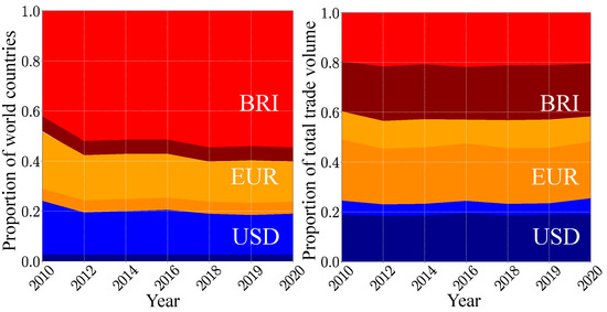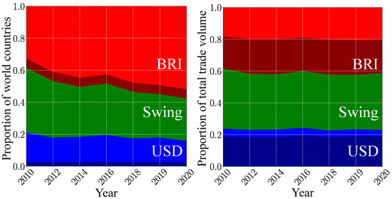 These results, obtained in the frame of our mathematical model, show that the hypothetical BRI currency will become dominant in present-day world trade. This is corroborated by the proportion of countries belonging, respectively, to the USD, the BRI and the swing groups (see Figure 4). The BRI group grows from about 38% of the world countries in 2010 to 58% in 2020. As the USD group only slightly decreases during this decade, the BRI group has mainly captured countries from the swing group. However, these captured countries have a somewhat small economic weight, as the relative proportions of the total trade volume corresponding to these three groups stay stable during the last decade. Hence, in 2020, the BRI group represents 41% of the total trade volume, the swing group 36% and the USD group the remaining 23%. For the USD group, the major trade volume is associated with the ANGL countries. By contrast, the BRICS+ only represent about a half of the total trade volume proportion of the BRI group. Contrarily to the USD group, the BRI currency is able to influence countries with a non-negligible economic weight way beyond the perimeter of the BRICS+.