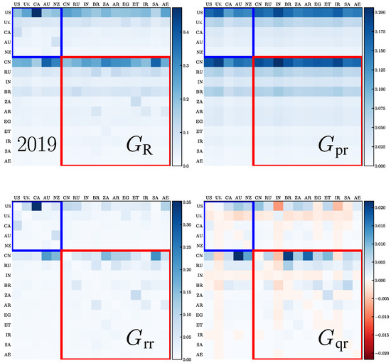 We present the REGOMAX description of the trade interactions between the 5 Anglo-Saxon countries (ANGL group) and the 11 BRICS+ countries obtained from the 2010 and 2019 WTN. The whole Google matrix G of the WTN has a size of that is the total number of countries. As described in Section 2.2, the REGOMAX algorithm allows for obtaining the reduced Google matrix of size , which describes the trade interactions between these 16 countries taking into account all their indirect interactions via the other countries of the global WTN. Thus, and its components characterize the integrated import flows. The matrix has three components, . All these matrices, , , , , are shown in Figure 5 and Figure 6 for the years 2010 and 2019, respectively. In each core group, ANGL and BRICS+, the countries are sorted according to their values of ImportRank and ExportRank , namely, by descending order of the value. We remind the reader that usually is close to a matrix composed by columns filled with the PageRank vector components of the countries, encodes the direct transitions between the countries and is obtained by the sum over all the indirect pathways linking the through the whole global WTN. By definition, the weight of the components are , and thus, , where the weights of the three matrix components are defined in the same way as for . For Figure 5 and Figure 6, we have and , and , and , respectively for the years 2010 and 2019. Thus, the main contribution to comes from and , while the contribution of , although small, provides important information on indirect trade transfers between the countries.