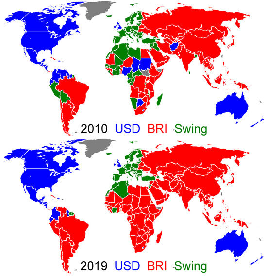 World distribution of the trade currency preferences for the years 2010 (top) and 2019 (bottom). The countries belonging to the USD group and the BRI group are colored in blue and red, respectively. Those belonging to the swing group are colored in green. Countries colored in gray have no trade data reported in the UN Comtrade database for the considered year [21]. The world distribution of trade currency preferences for 2012, 2014, 2016, 2018 and 2020 are presented in Figure A1.