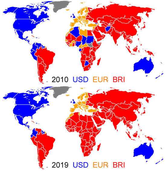The world distributions of the TCPs for the years 2010 and 2019 are shown in Figure 8. We observe that both in 2010 and 2019, the USD group gathers, beside the ANGL group countries, the Central American countries and some of the countries of the northern part of South America; the EUR group gathers, besides the EU9 group countries, the European countries delimited to the east by the NATO border; the BRI group gathers, beside the BRICS+, most of the Asian and South American countries. The main difference between the 2010 and 2019 years is the situation of the African continent. Although this continent appears fragmented in 2010, echoing the post-1989 era battle of influence between France, the USA, Russia and China, in 2019, the whole African continent appears to be under the influence of the BRI with the exception of Morocco and Tunisia. By comparison with the two currencies model (see Section 3), the introduction of a third currency, namely, the EUR, crystallizes the swing group: undecided countries in the two currencies model now adopt a fixed currency preference independent of the initial distribution of the TCPs. Moreover, the new EUR group mostly corresponds to the swing group (see Figure 2).
