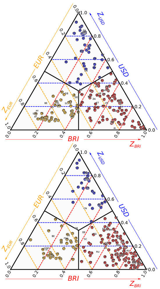 Distribution of countries’ TCP scores for 2010 (top) and 2019 (bottom). A country is represented by a circle. Colors are associated with TCPs: blue for USD, gold for EUR and red for BRI. The coordinate is read along the dashed blue horizontal lines, the coordinate along the gold dashed oblique lines and the coordinate along the red dashed oblique lines.