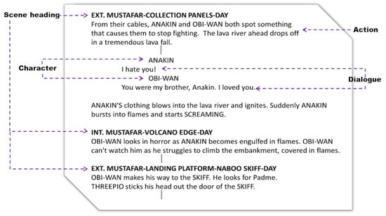 A piece of the script extracted from the movie ‘Attack of the Clones’. The figure illustrates elements of a movie script: Scene Heading, Character, Action, and Dialogue.
