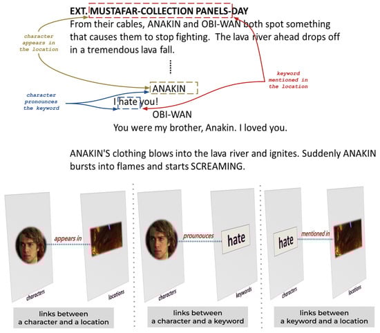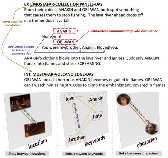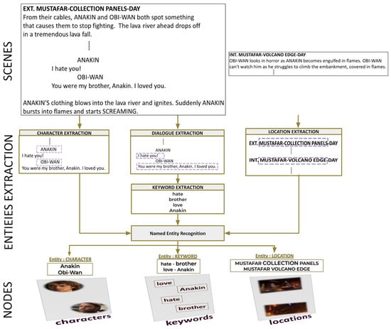The first step of the process is to chunk the script into scenes. Figure 3 provides an overview of extracting entities from the script. Due to the straightforward structure of the text, identifying locations and characters is a simple task during analysis. For instance, consider the first scene. The location MOSTAFAR COLLECTION PANELS in the scene heading is placed just after the physical space EXT. ANAKIN and OBI-WAN are the characters. The keywords are retrieved from dialogues using the latent Dirichlet allocation (LDA) [29] method. Named entity recognition (NER) is a tool used to identify different types of entities: characters, keywords, and locations within action lines. Figure 4 and Figure 5 provide an example of the extraction of intralayer and interlayer links, respectively.
