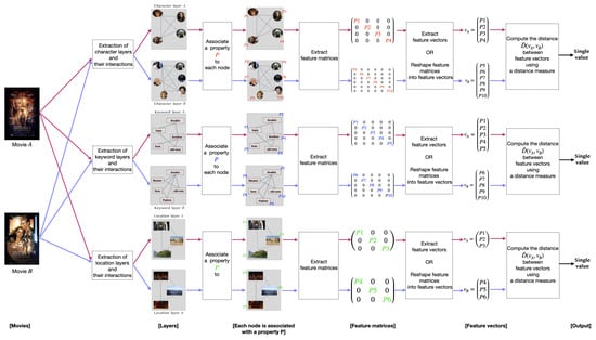 Markovic et al. (2019) [13] conducted a study to construct the character network of Slovene belles-lettres based on its interaction structures. To evaluate their interactions, they created a list of main characters and indexed sentences in which they appear. The distance between characters is then computed based on their frequency of occurrence in the text. Lv et al. (2018) [14] proposed StoryRoleNet, an algorithm to construct the character network of a movie from its corresponding video and subtitle. Then, they identified the main characters using the Louvain algorithm for community detection. In another study, Chen et al. (2019) [15] suggested using the minimum span clustering algorithm on community structures and centrality to find the distance between characters extracted from the novel Dream of the Red Chamber. All these studies aim to calculate the distance between individual characters in a narrative and identify the most important ones. Mourchid et al. (2019) [16] proposed visualizing characters, keywords, locations, captions, and faces in Star Wars using community detection. They identified the top ten nodes within individual layers by comparing influence scores of their corresponding diameter, number of nodes, number of edges, clustering coefficient, shortest path, assortativity, number of communities, and modularity. However, despite considering many components of the movie story, they also rely on analyzing individual characters by highlighting the main ones. To the best of our knowledge, there is currently no approach for measuring the similarity between movie stories, verifying two aspects: (i) regarding many components of the movie story and (ii) quantifying the distance between corresponding movie networks. Thus, we aim to quantify the similarity between a couple of movies by assessing the distance of their corresponding networks considering many elements. We rely on the multilayer network model [12] to extract three-layer entities, i.e., character, keyword, and location. We then compute the distance between these layers using graph distance techniques. Determining the distance between networks is a challenging task in network science, as a distance measure may work well on one type of graph but not on another, depending on the network structure and topology. Our primary objective is to investigate the effectiveness of graph distance measures for estimating movie similarity so that they can be incorporated into recommendation systems.