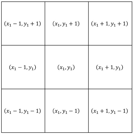 This filter application is a non-linear procedure [47]. It involves constructing a nine-point mask around a pixel in the decrypted image affected by noise, as illustrated in Figure 1. The pixels in the mask are arranged based on intensity, and the median value is selected. This median value, denoted as , with c indicating the basic color, must be greater than or equal to the first pixels and less than the remaining ones.
