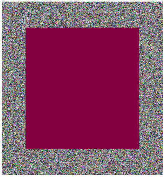 The entropy-enhancement algorithm begins by denoting an encrypted image as A. Its dimensions are 512 × 512 pixels and it has a discrete area equal to 262,144 pixels. We will detail the algorithm used to encrypt images in Section 4. With this in mind, it is important to highlight that it is possible to obtain three color histograms from the encrypted image. Each one comprises 256 intensities i in the range of . The frequency of each intensity is denoted as follows: , , and , where r, g, and b represent the basic colors c, and i is the intensity. Additionally, it holds true for each color that = 262,144. As part of the proposed method, the size of the encrypted image is increased by approximately 8% to improve the encryption quality. The advantages of this enhancement will be presented in Section 6. To achieve this, rows of 512 pixels are added to the encrypted image A after row 511. Image enlargement finishes when the number of pixels is greater than or equal to × 1.08. Let us denote the increased discrete area with n new rows as . The value of each frequency in the enlarged image is around the value h defined in Equation (20).