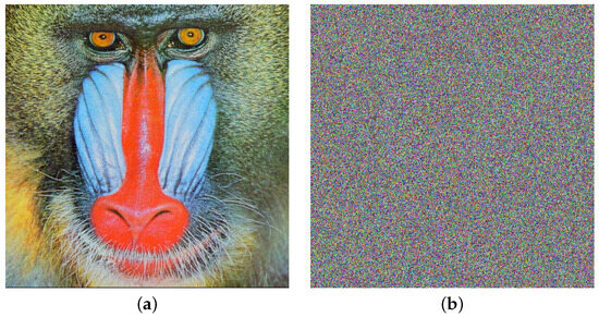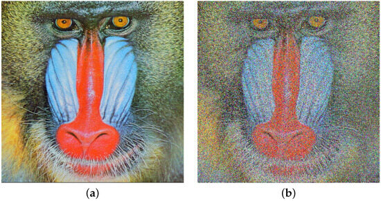 In the first case, a plain image is compared with an encrypted one to simulate the total noise damage. If a figure is well encrypted, UACI [43], and consequently, . This would indicate a total loss of sharpness, signifying complete information loss.