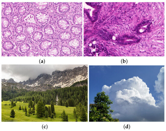 Examples of reference images include: images (a,b) in the Warwick QU Dataset, which represent benign and malignant cases, respectively, each with a size of ; image (c) is a natural image with a size of ; and image (d), called the wallpaper, with a size of , is used to verify the method’s performance on large-scale data.