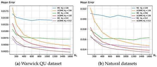 (a) depicts the average error variation in MCSampEn2D and UCBMCSampEn2D experiments on the Warwick QU dataset with changing , where parameters are set to and ; (b) depicts the average error variation in MCSampEn2D and UCBMCSampEn2D experiments on natural datasets with changing , where parameters are set to , , and . The reward function is set as the cosine function.