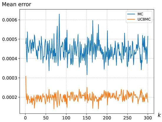 Figure 2 provides a detailed view of the situation with sampling points set at . Based on the experimental results, it is evident that the UCBMCSampEn2D algorithm demonstrates more rapid convergence with an increase in the number of experiments () compared to the MCSampEn2D. In Figure 2, with , the UCBMCSampEn2D algorithm initially exhibits a larger error during the first 150 rounds of experiments. However, as the number of experiments increases, the UCBMCSampEn2D algorithm quickly reduces the error and achieves a lower convergence error than the MCSampEn2D. This substantial improvement in accuracy is consistently observed across various values of .