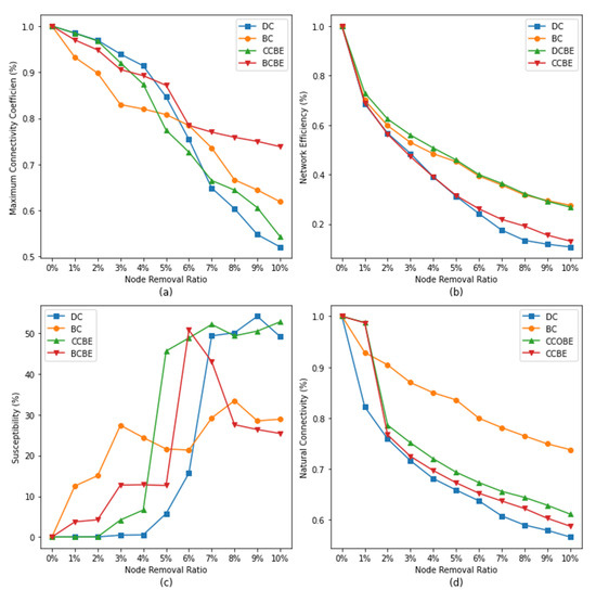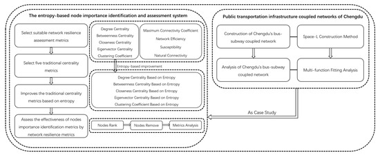 - This study introduces the entropy-based node importance identification and assessment system. Five centrality metrics are improved based on entropy for node importance identification in coupled networks. Moreover, this research takes the Chengdu bus and subway coupled network as a case study, and four network resilience metrics are selected—the maximum connectivity coefficient, network efficiency, susceptibility, and natural connectivity [27]—to evaluate the performance of the system.