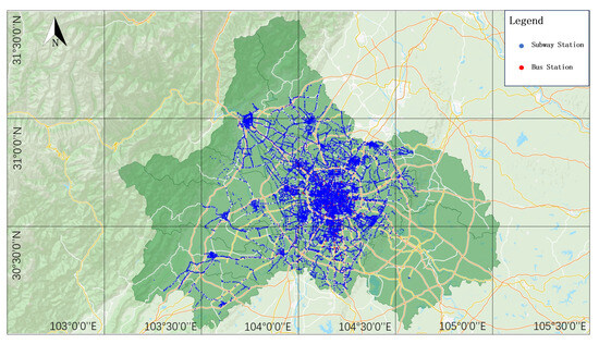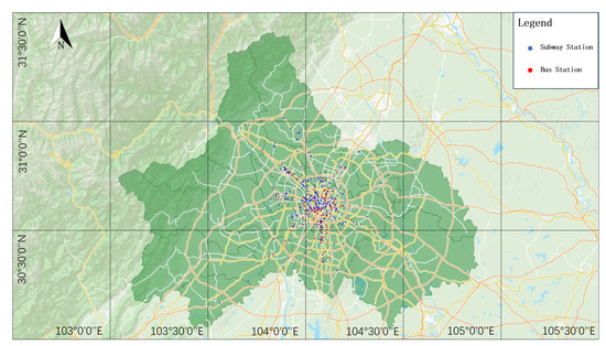 - Based on the modernized multi-level and multi-modal public transportation infrastructure network in Chengdu, a bus–metro coupled network containing 10,652 nodes and 15,476 edges is constructed and a network dataset is formed.