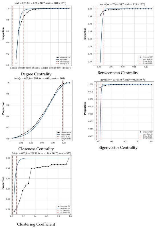 - The node betweenness centrality and eigenvector centrality distributions show extreme positive skewness, which means that the vast majority of nodes have very low values and only a very small number of nodes have high values, where approximately 80% of the nodes’ and values are close to 0. This distribution indicates the existence of a number of key nodes in the network, which play an important role in disseminating information, controlling flows, or connecting different communities. At the same time, most of the nodes have low values and may be relatively common nodes. Due to the large size of the network, there may be clusters of highly connected nodes or tight connections between some of the nodes.