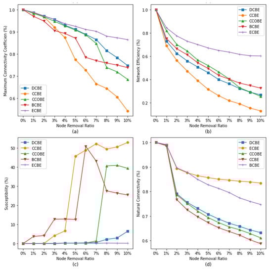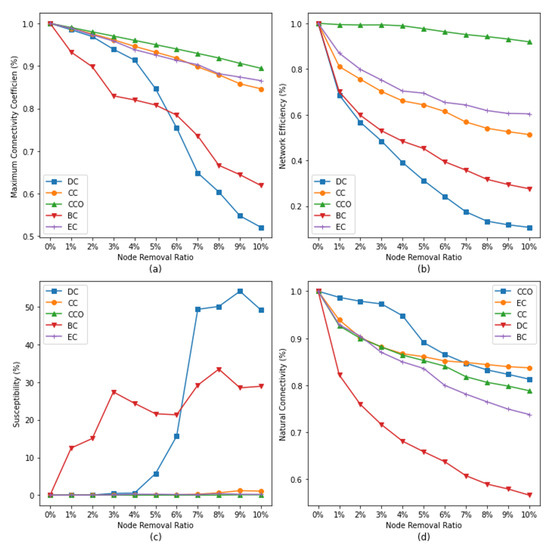 - Ghedini, C.G.; Ribeiro, C.H.C. Rethinking failure and attack tolerance assessment in complex networks. Phys. A Stat. Mech. Its Appl. 2011, 390, 4684–4691. [Google Scholar] [CrossRef]