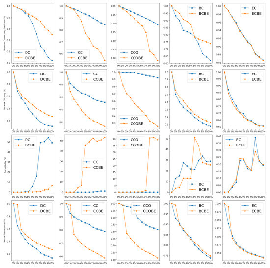 - For , its performance decreases after the improvement, which is due to the fact that can visually represent the degree of association of a node with other nodes. Moreover, for network resilience, the degree centrality of a node itself is much more influential than that of its neighbors; even if it is improved by entropy, it will not be able to improve its evaluation—rather, it leads to a decrease.