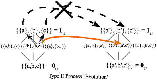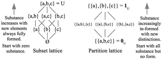 In terms of the old notions of matter (or substance) and form, the bottom of the partition lattice has all the substance but no form (no dits). The quantum notion of distinction-making change is prefigured by moving up the partition lattice as the substance is increasingly in-formed by distinctions until finally reaching the classical state . As a metaphor for the Big Bang, in the beginning there was all the substance (energy) but with no distinctions, i.e., “perfect symmetry” [], and then distinctions were introduced by symmetry-breaking to create (more definite) “its from dits.” That partition notion of becoming (indefinite to more definite) is particularly important for our purposes since it prefigures the notion of quantum (projective) measurement (von Neumann’s Type I processes) as well as quantum jumps.