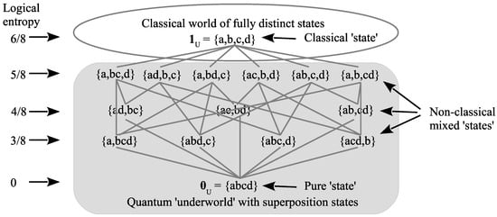 Figure 2 is the Hasse diagram of the partition lattice on a four-element set, which means that each line between two partitions represents the partial order of refinement with no intermediate partitions. Then, the change from a partition to a more refined one is a “jump”. The skeletonized mixed states in the lattice of partitions of Figure 2 are all those that might be obtained by a “projective measurement” of the pure state , i.e., by the partition join version of the Lüders mixture operation. All the lines or links in Figure 2 go from an indefinite state upward to a more definite state that is part of a join operation. A projective measurement turns a pure state into a mixed state, one part of which, e.g., an eigenstate in a maximal measurement, is realized according to its probability.