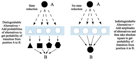 For a pictorial image of the notion of superposition as creating indefiniteness or indistinction, the left side of Figure 4 gives the superposition of two isosceles triangles with labeled (i.e., distinguished) edges and vertices as the triangle that is indefinite on the edges and vertices where they differ and only definite where the two triangles are the same—and certainly not the triangle that is doubly definite (like a double-exposure photograph).