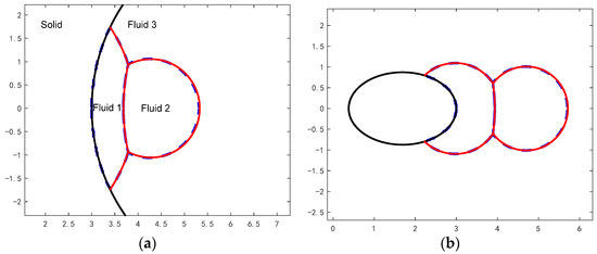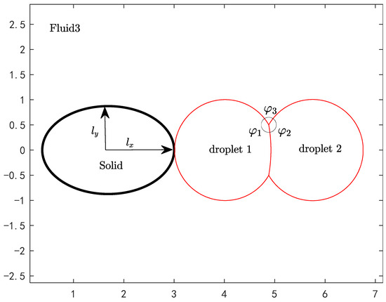 Several kinds of solid walls with different geometries will be considered. To illustrate the basic physical settings, we choose the wetting of compound droplets on an ellipsoidal wall (corresponding to a prolate spheroid in three dimensions) as an example. As shown in Figure 1, the initial compound droplet of the Janus type is composed of two droplets of different components (fluid 1 on the left and fluid 2 on the right) that have been fused together to be in static equilibrium. The volumes of the two droplets are both equal to 4.189 (about the volume of a sphere with a radius of ). In other words, we chose the reference length as . Note that the initial state may be also realized by placing two spherical droplets of radius 1, one of fluid 1 and the other of fluid 2, in contact and letting the system evolve freely under the action of interfacial tension (with dissipation) to equilibrium. To circumvent this step, we employed the analytical solution for the final equilibrium configuration under given interfacial angles. The surrounding environment is fluid 3. The angles at the triple junction measured in fluid in Figure 1 are called interfacial angles and, for cases other than total spreading, they satisfy