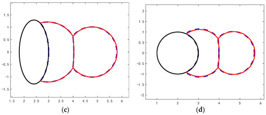 First, the equilibrium shapes of compound droplets on several types of solid walls are calculated by numerical simulations and compared with the corresponding analytical solutions based on the equilibrium conditions (see Appendix D and Appendix E for the derivation of the analytical solutions of the equilibrium state of the compound droplet on different walls). The total simulation time in each case is . At this time, the total kinetic energy of the compound droplet has approached zero. The comparisons between the numerical and analytical results are shown in Figure 2, where the blue dashed lines are the interfaces obtained by our simulations and the red solid lines are from the corresponding analytical solutions. The common parameters used in the simulations are: , , , , , (). Note that the other two CAs in Equation (27) are not important here because only the left droplet wets the wall. The interfacial angles of Figure 2a,d are:, , . Interfacial angles of Figure 2b,c are:, , . The solid wall in Figure 2a is concave (i.e., having negative curvature) and its radius of curvature is . In other words, the droplet wets the inner surface of a sphere. The solid walls in Figure 2b–d are all convex (i.e., the droplet wets the outer surface of an ellipsoid or a sphere). In Figure 2b the prolate spheroid has semi-axis lengths in the x-direction and y-direction , . In Figure 2c, the oblate spheroid has semi-axis lengths , . In Figure 2d, the sphere has a radius of . From Figure 2, it is observed that the equilibrium interface positions by our simulation are close to the theoretical solutions for all cases. Thus, our numerical method should be reliable to predict the wetting characteristics of Janus droplets on curved walls. It can also be seen from Figure 2 that as the curvature of solid wall varies, the shape of droplet 2 changes slightly whereas the shape of droplet 1 changes more significantly. When the wall curvature decreases with all other conditions fixed, the contact area between droplet 1 and the solid wall increases as found through the comparison between Figure 2a,d (or through the comparison between Figure 2b,c).
