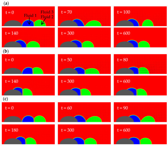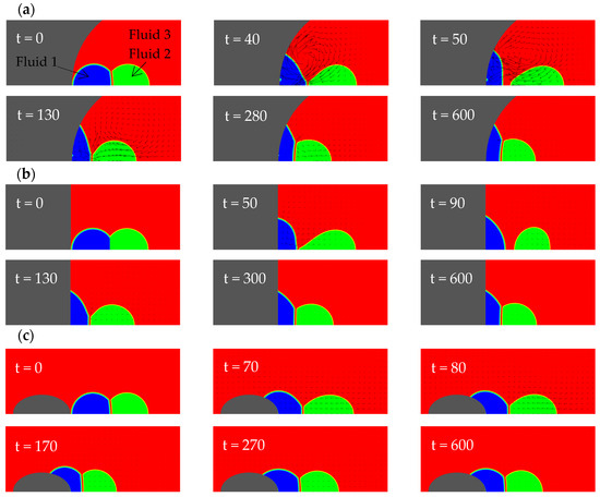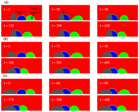 As seen from the above, it is more difficult to make the compound droplet separate on an ellipsoidal wall than on a concave wall or a planar wall. Next, we further explore the wetting of a Janus droplet on ellipsoidal walls with different curvatures. Three different ellipsoids with the same volume (4.189) were studied. The first is an oblate spheroid with , . The second is a unit sphere. The third is the prolate spheroid just studied previously. The interfacial angles are slightly different from those in the above: , , . The other parameters are the same as those in Figure 3c. The flow field evolutions for the three cases are shown in Figure 7.
