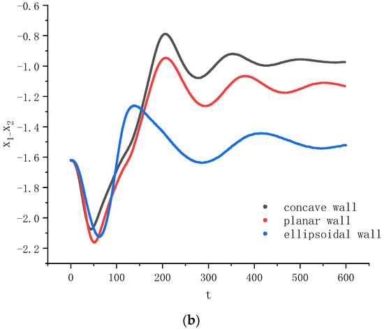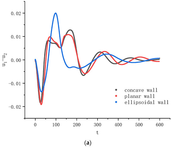 where represents the region where . Figure 4 shows the evolutions of the relative velocity and position between the left and right droplets’ centroids along the x-axis, and , respectively, for the three cases in Figure 3. It can be seen from Figure 4a that in the early stage (), the relative velocities are negative for all cases, and its magnitude first increases and then decreases. During this stage, the maximum magnitude of the relative velocity (abbreviated as MMRV for brevity below) for the third case (the ellipsoidal wall) is the largest, the MMRV for the planar wall is the smallest, and that for the concave wall is in between. Interestingly, although the MMRV is larger on the concave wall than that on the ellipsoidal wall, the maximum distance between the two droplets’ centroids is smaller on the ellipsoidal wall during the early stage, as seen from Figure 4b. This is because the change in distance is determined by the integration of the relatively velocity in time, not by the MMRV. It can also be seen in Figure 4b that the maximum distance is the largest for the flat wall. From Figure 3 and Figure 4, it seems that whether the Janus droplet splits is more related with the MMRV than with the maximum distance between the two droplets.