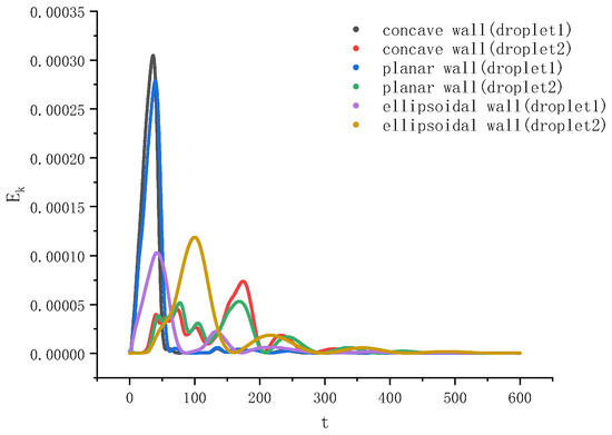The evolution of the kinetic energy of the two droplets was also monitored, as shown in Figure 6. From this figure, it is found that the maximum kinetic energy of the left droplet (observed during the initial stage when it wets the surface) on the ellipsoid is much smaller than those on the concave and planar surfaces. This is not only because the attraction of the ellipsoidal wall to the droplet is the weakest (due to its particular shape), but also because the interaction between the two droplets on the ellipsoid has always been relatively large (as no separation occurs), and the left droplet is retarded by the right droplet the most. On the other hand, the maximum kinetic energy of the right droplet (observed after the initial stage) on the ellipsoid is the largest and occurs the earliest among all three cases. The reason is as follows. Because the compound droplet on the ellipsoid does not split, the right droplet is always in an accelerated state in the early stage of the wetting process. In contrast, for the planar and concave walls, the right droplet accelerates first, then decelerates after separation, and then accelerates again after the two droplets reconnect. For all three walls, the kinetic energies of both droplets become very low after a long time (e.g., ), as seen in Figure 6.